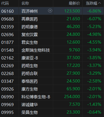 4月9日消息,港股生物医药股集体大跌,百济神州、再鼎医药跌超6%,药明康德跌超5%,复宏汉霖、君实生物跌超4%,金斯瑞生物科技、康诺亚、药明合联跌超3%。